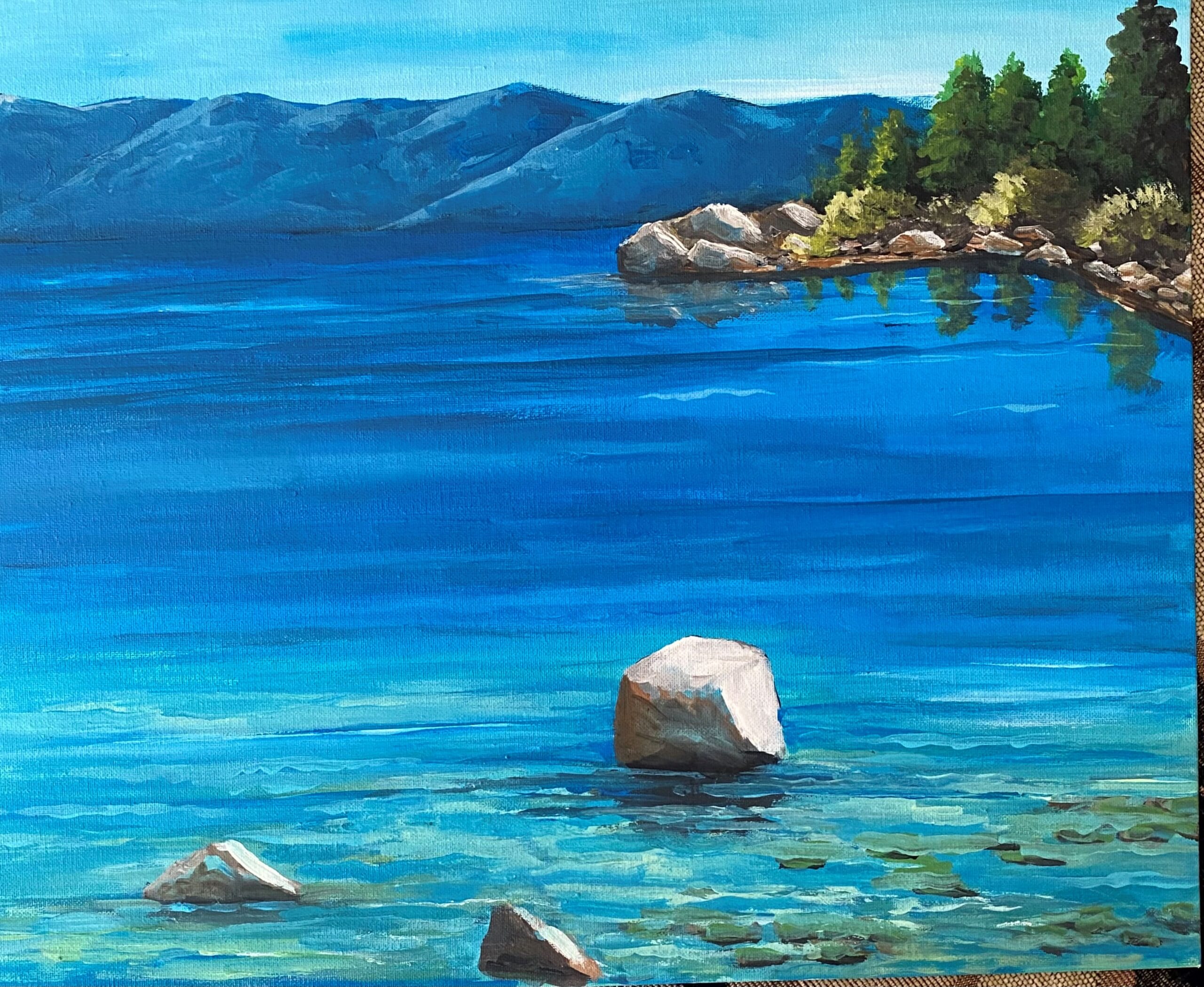 Canvas: Flat | Colors: Mixed | Dimensions: 11×14 | Not Framed | Medium: Acrylic | Orientation: Horizontal | Price: $388 | Setting: Outdoor | Size: Small | Style: Photorealism | Subject: Lakeside | Theme: Environment