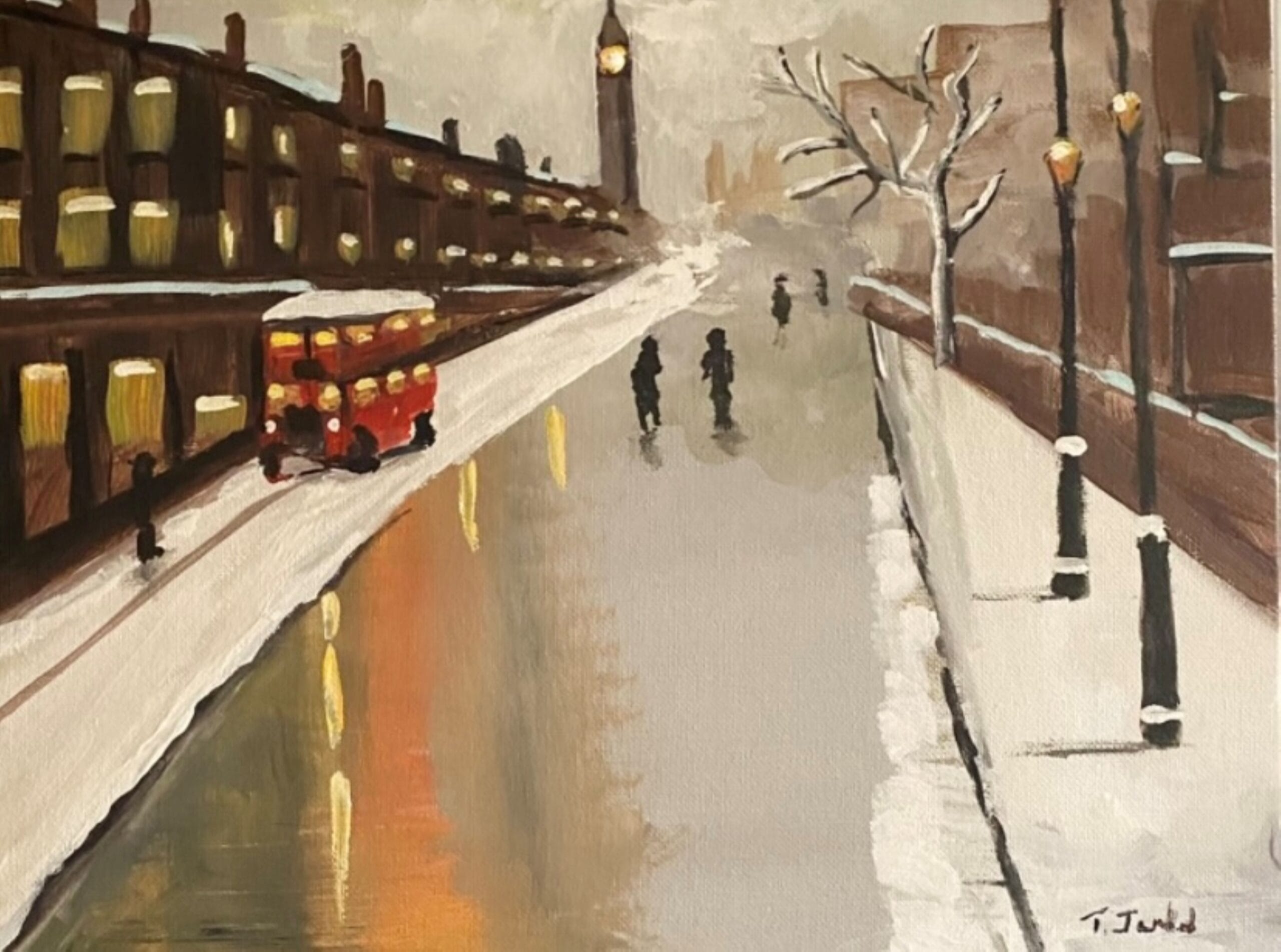 The artist created a scene of the hustle and bustle of a day in London. It has all the elements of an exciting day, the bus, Big Ben, snow , people moving around etc.
