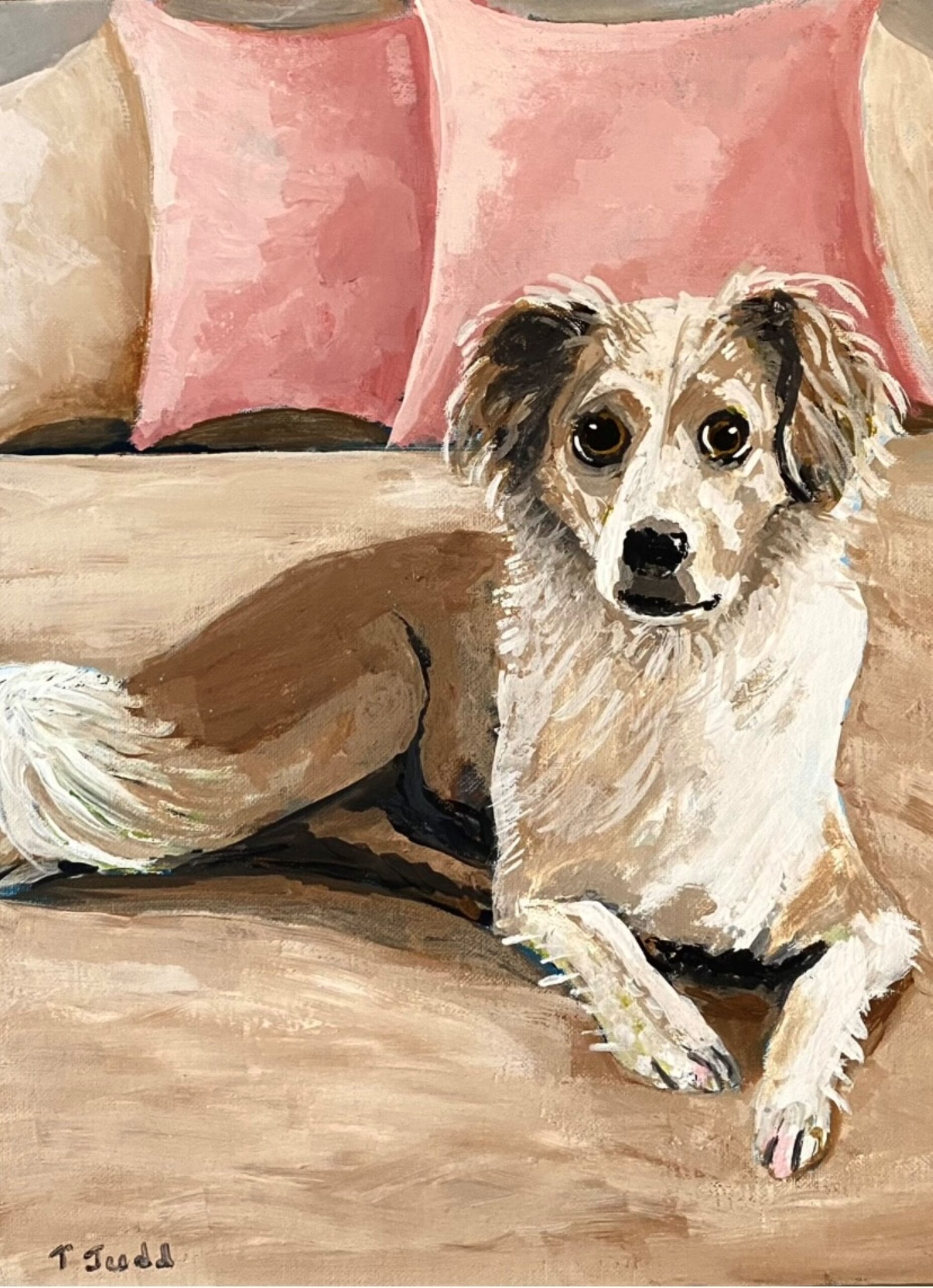 A true friend able to hang in your room right by you. This darling dog looks cozy on his master’s bed surrounded in pink pillows… ready for adoption