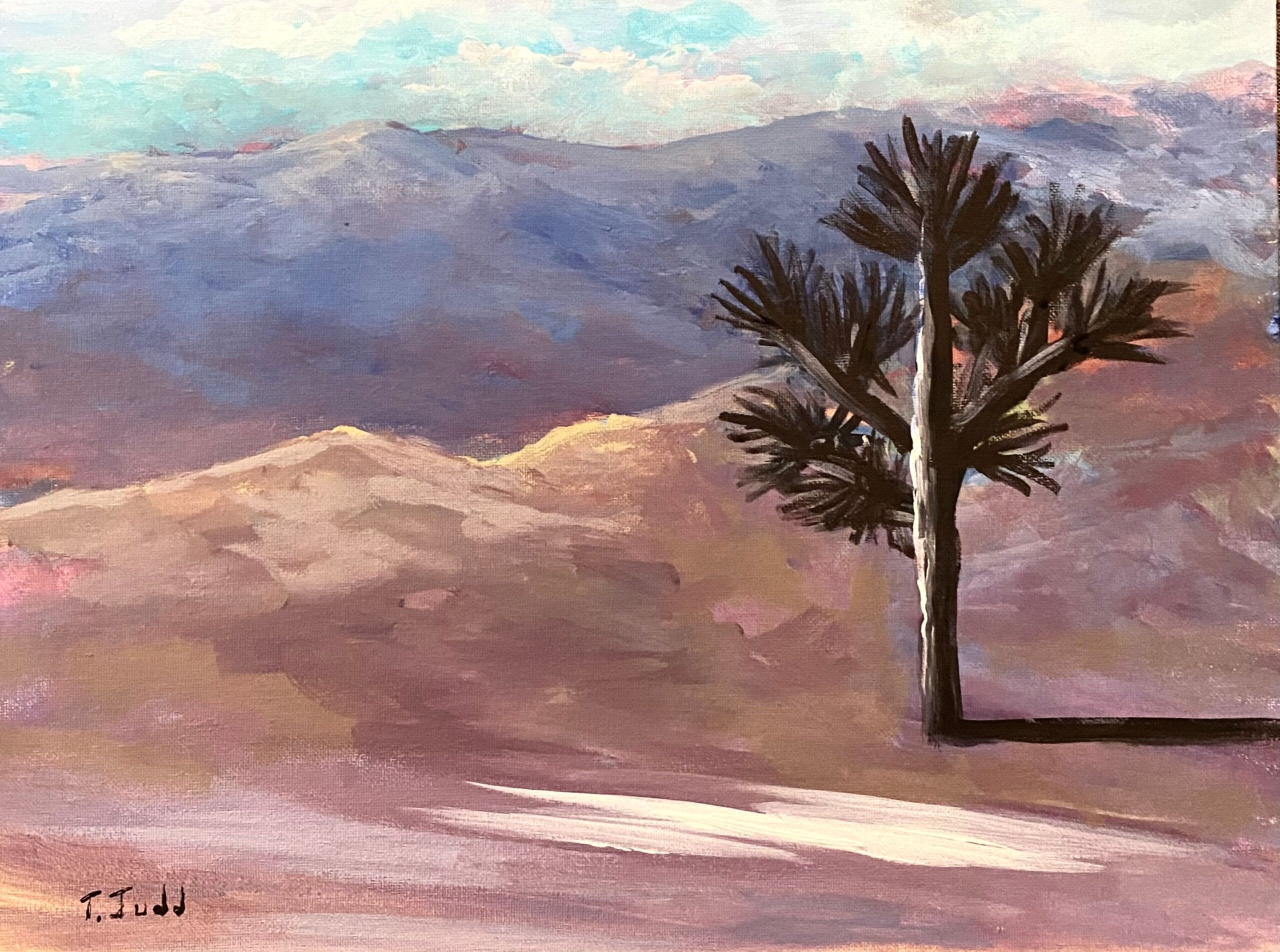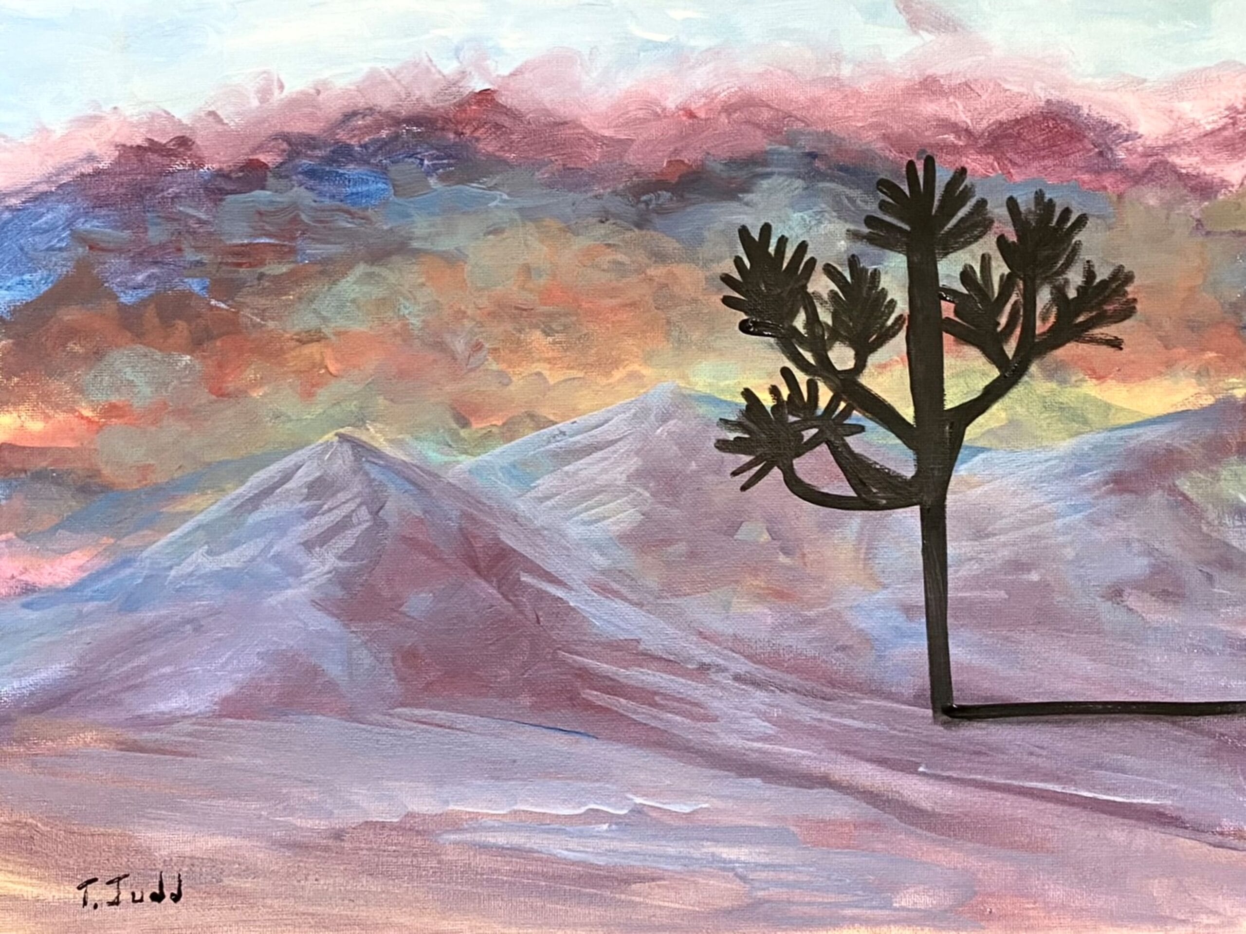 The artist captures the dessert in a different way using the soft colors of purples with the contrast of the black silhouette of the Johua Tree. She makes dreaming of walking in the desert easy and cactus free.