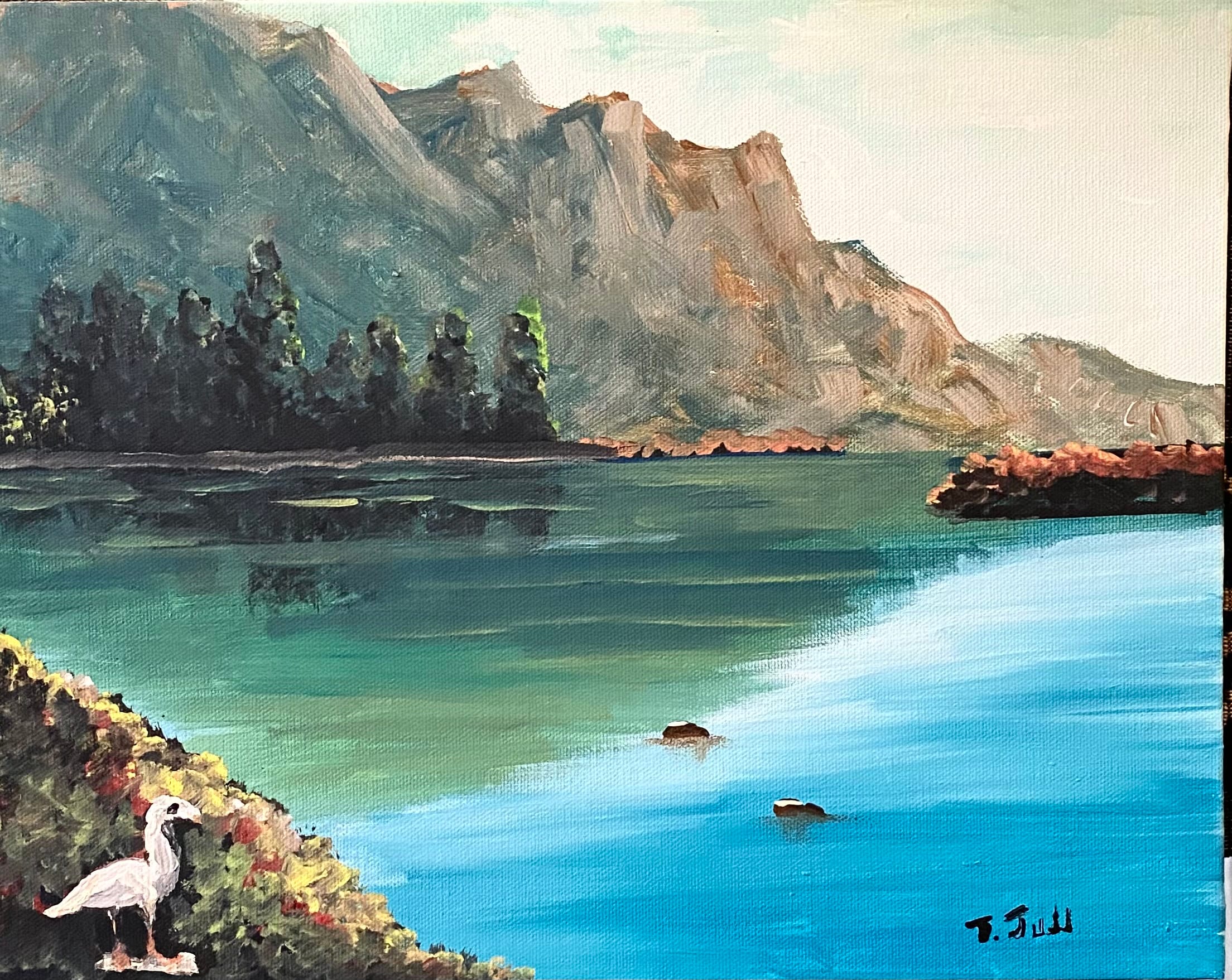 Nestled in the bushes appears a lone white duck, so small and yet so important to the scene. the blue green lake calls and yet he stays safe amidst the bushes.