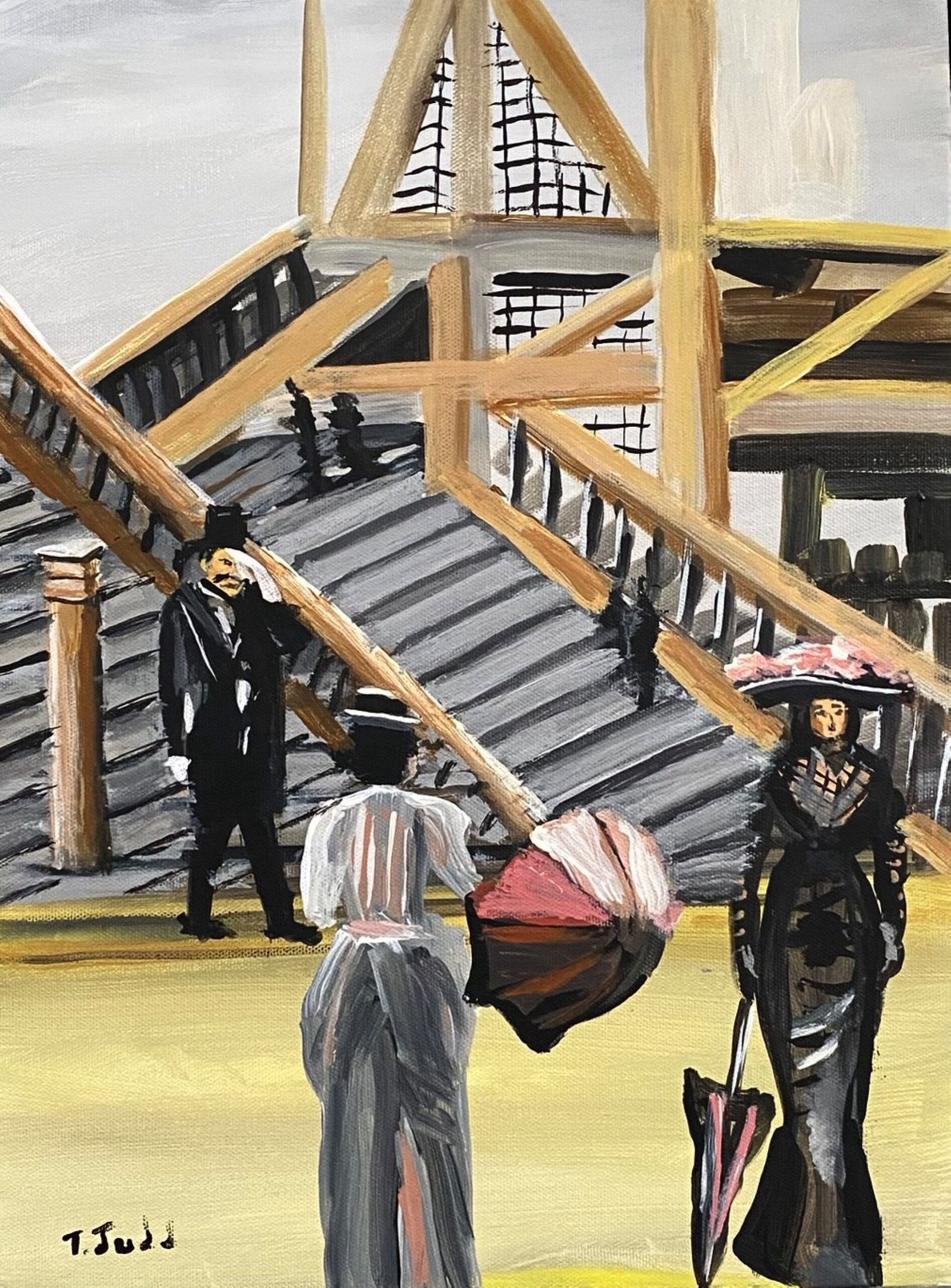 As a lover of the movie Titanic, this piece is inspired by the old-fashioned clothing, umbrellas and mode of transportation. This painting has the feeling of the past and all of its wholesome beginnings.