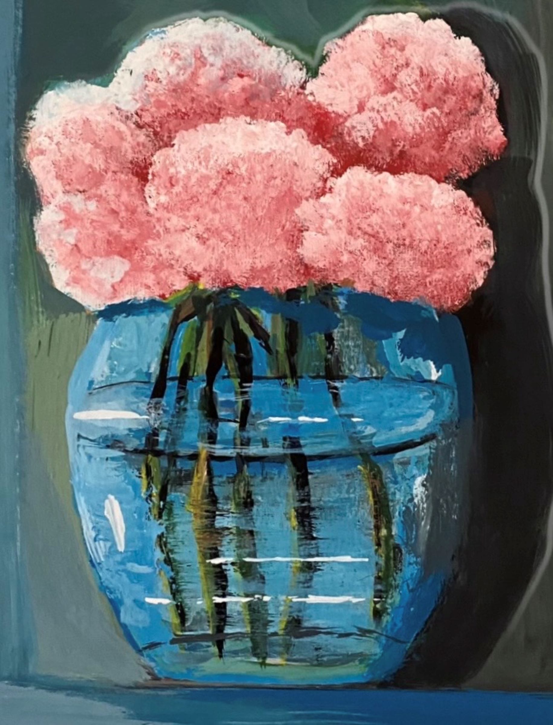 These flowers look good enought to eat; thinking of the snowball cakes and yet probably smell like the aroma of a delicate flower.  These flowers in a glass bowl painted an inviting blue water for each stem.