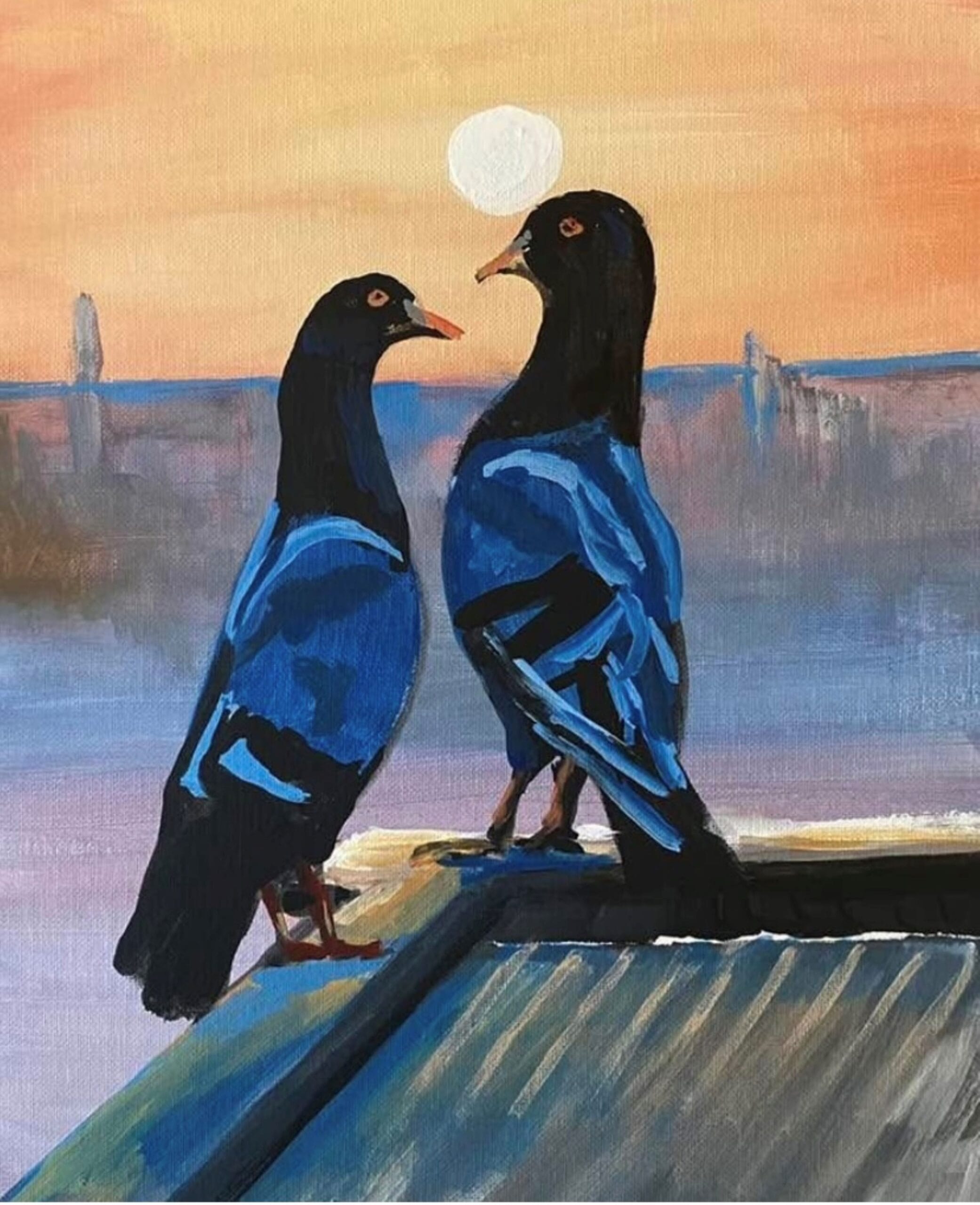 This 11 x 14 has a darling set of birds almost as if they were a Mr. and Mrs. conversing. The colors are vibrant, and the background sunset is inviting as a great visual.