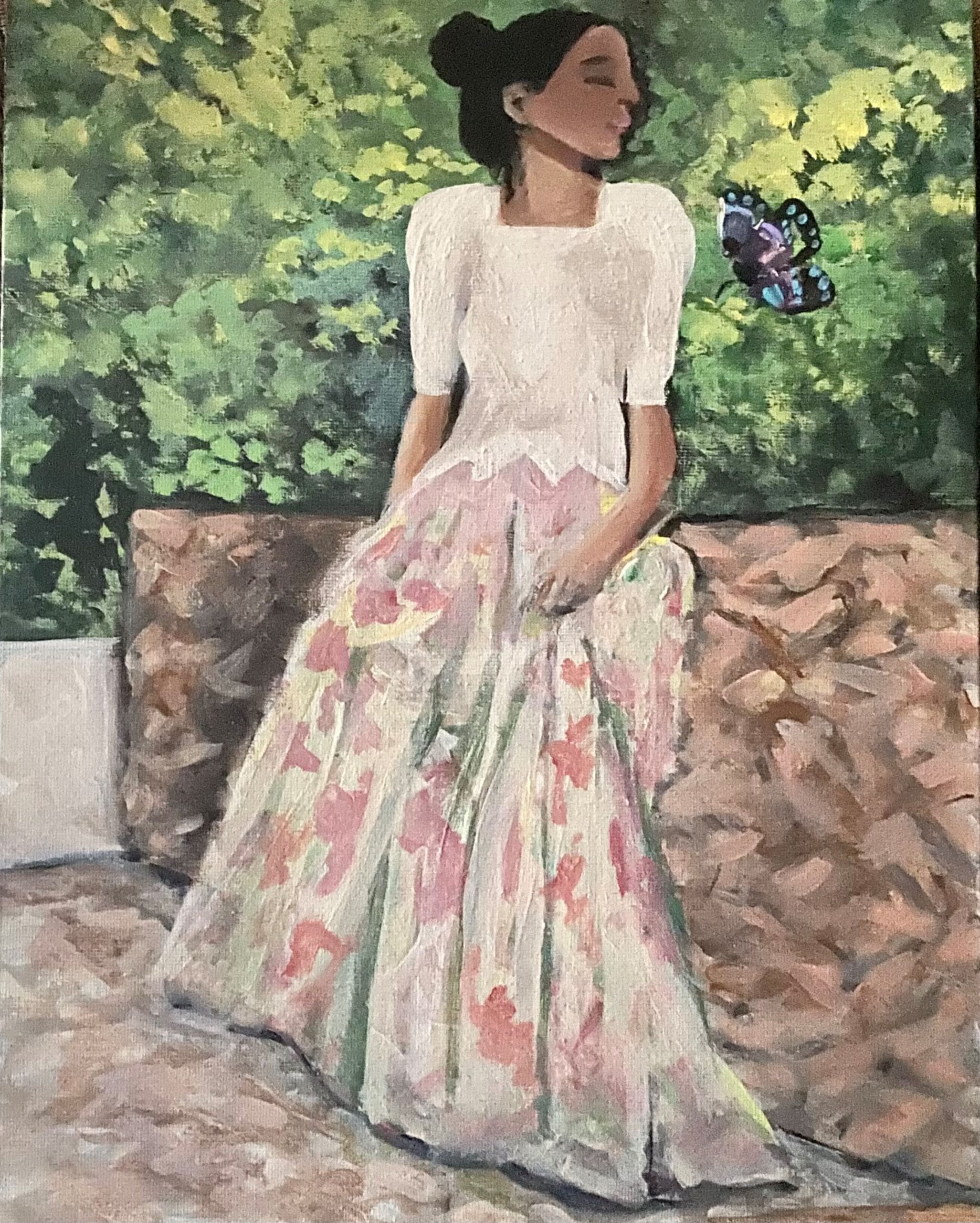 A garden scene with a beautiful woman watching the butterfly by her landing on some greenery. Old fashioned dress adds to the beauty of this garden scene