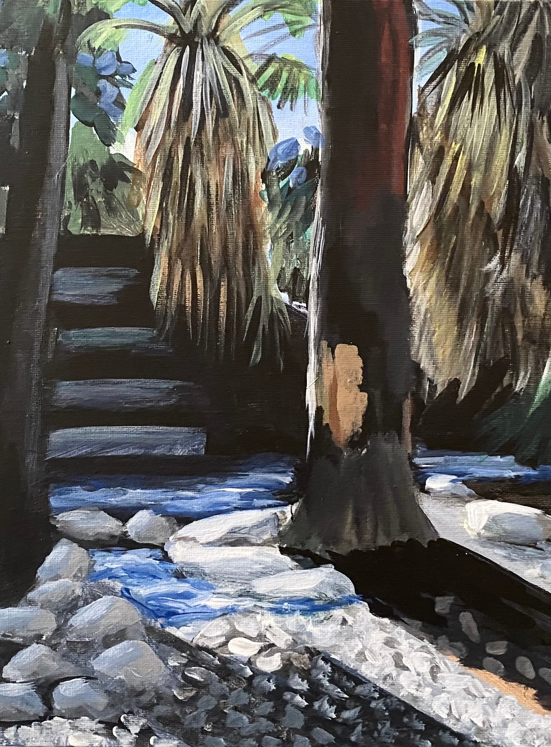 Up the hill amongst the rocks and Palm trees you find a hidden place called Tahquitz in Palm Springs, CA.  This captures the beauty of the palms, rocks and streams that flow through the desert area.