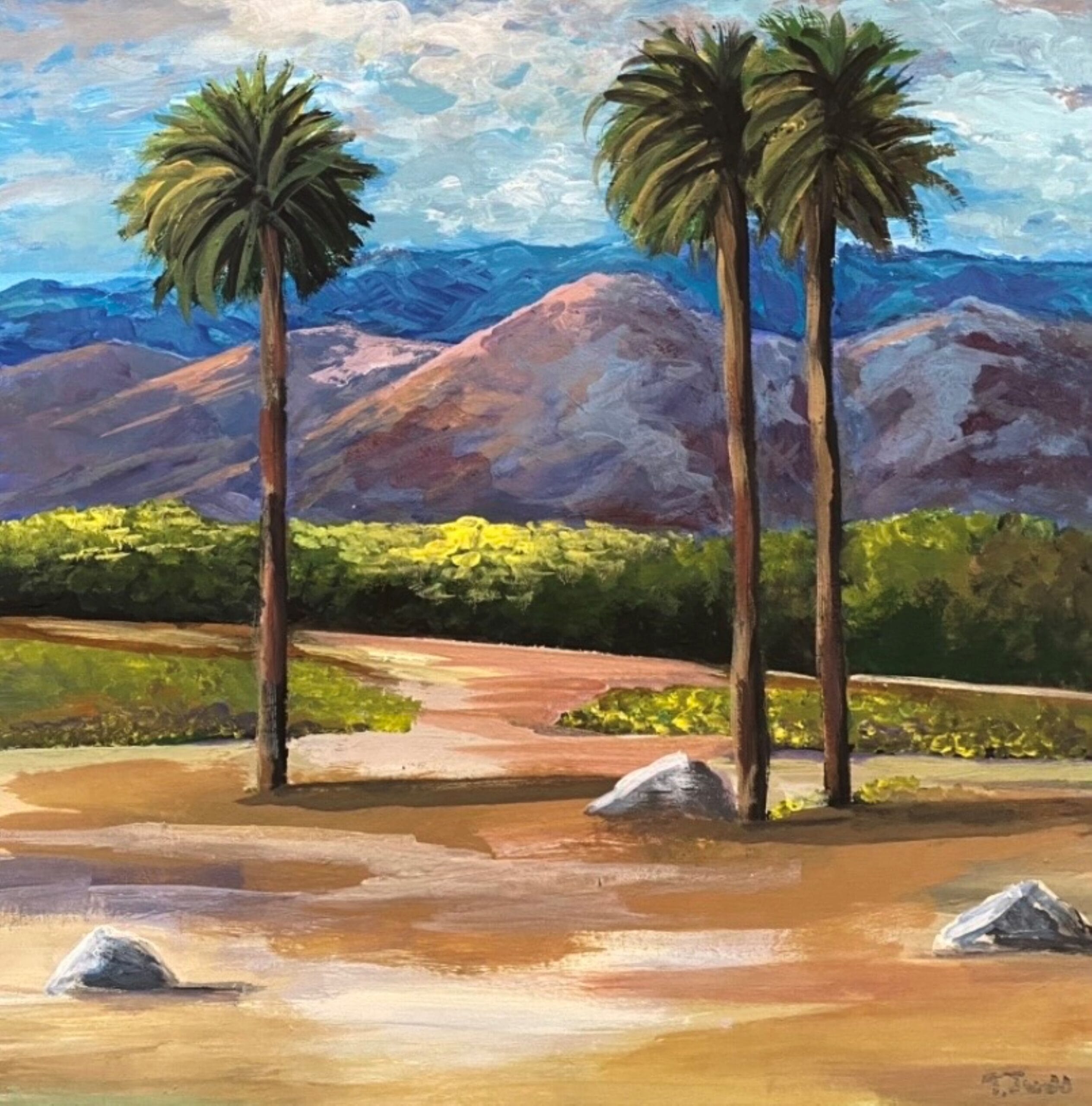 Three Palm Trees, three bold rocks…makes for a great desert scene. Lots of colors for the desert and always enjoyable to view. On a stretched canvas.