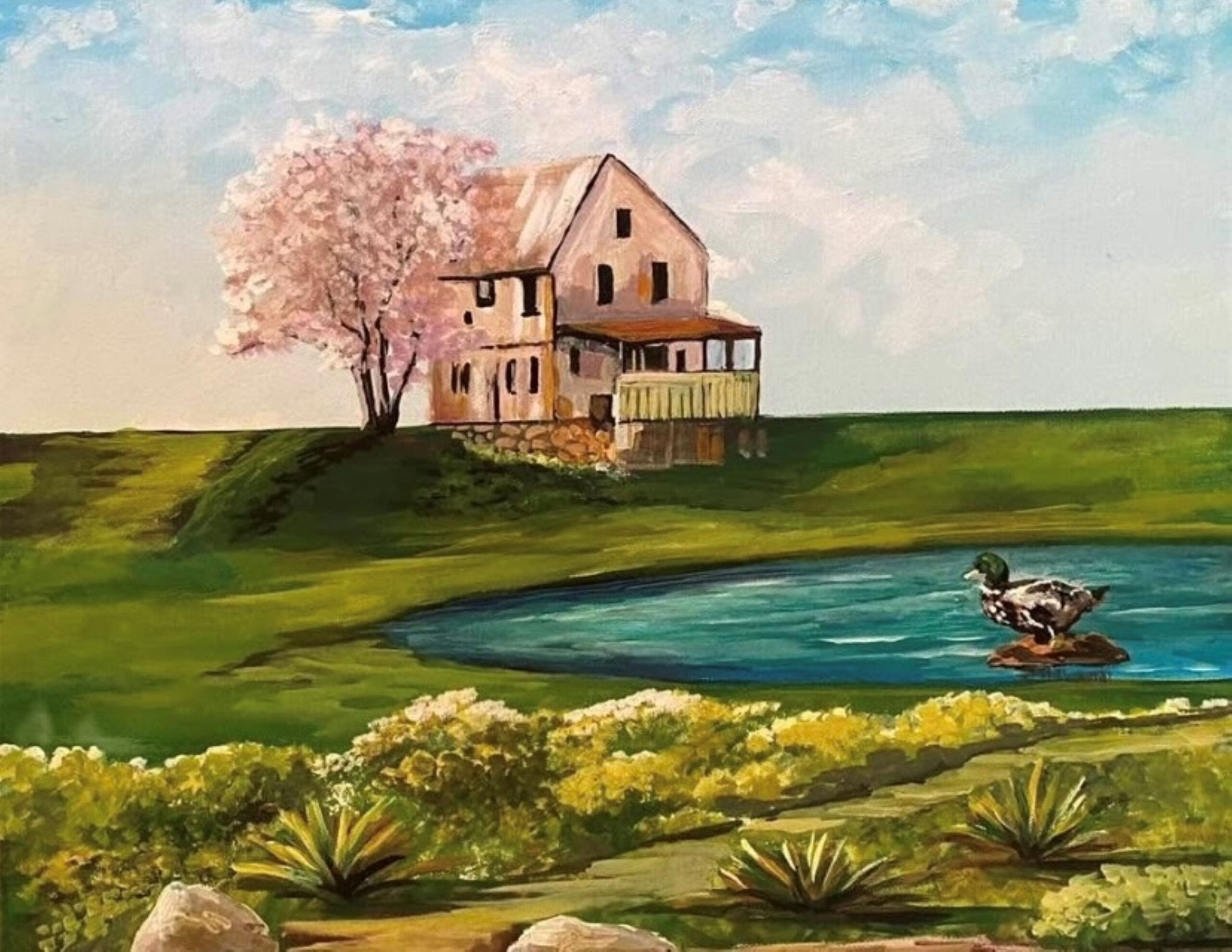 The Artist here captures everyone’s dream home with open green spaces, a country home and your ducks on the pond. The pond with flowers around it adds to the country style everyone can picture.