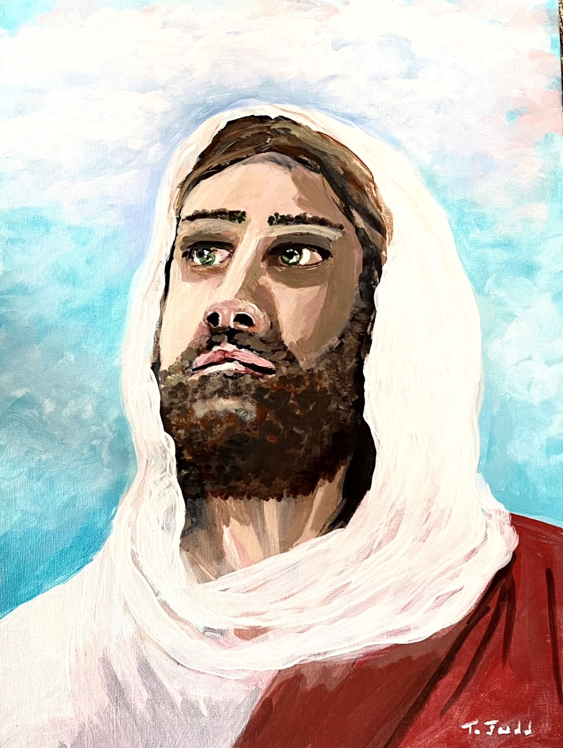 He looks unto His Father says it all.  This depiction of Jesus brings to mind his many names: Prince of Peace, The Almighty, The Good Shepherd, all under the direction of His Father.